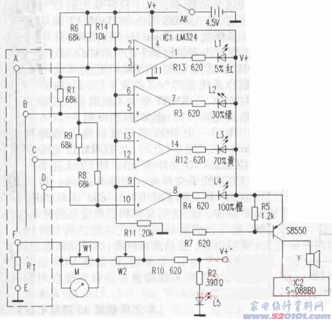 检查V+4.5V电压正常,把③脚和电池负极相碰,模拟试验其水位已达A点,L1仍不亮,检查L1正常,R13正常,但是Ic①脚电位始终为高电位。查另外几路L2~L4,也一样,测量Ic1④、11脚内阻均比正常的高,说明IC不良,用一只正品LM324更换后试机即正常。