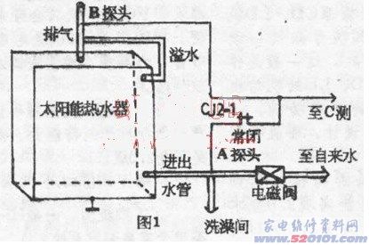 一、装设探头按图1的位置,在热水器排气管及进出水管上用φ4的钻头在钢管上钻两眼,取单芯铜塑线5cm长两节,使铜芯裸0.5cm长,分别塞进AB两管眼内一小半作为水位探头,注意铜线与水管绝缘良好,以防控制器误动作,用树脂胶粘固以干后不漏水为止。