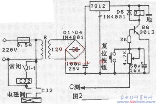 接通电源,三极管BG基极经CJ2-1测得A点无水时,BG截止,继电器J1常闭触点J1-1接通,接触器CJ2线圈得电,接触器吸合,电磁阀打开。当水位上升到B点时,BG饱和导通,继电器J1吸合,J1—1断开,cj2线圈失压,电磁阀关闭。当水位线低于B点时,BG基极电流经CJ2—1常闭触点接通,BG继续饱和导通,电磁阀关闭,待水位降至A点以下时,电路恢复原来状态。