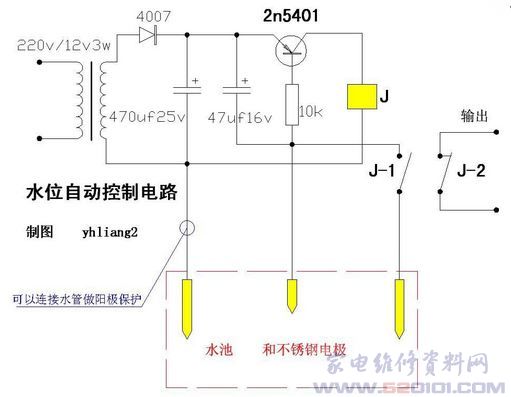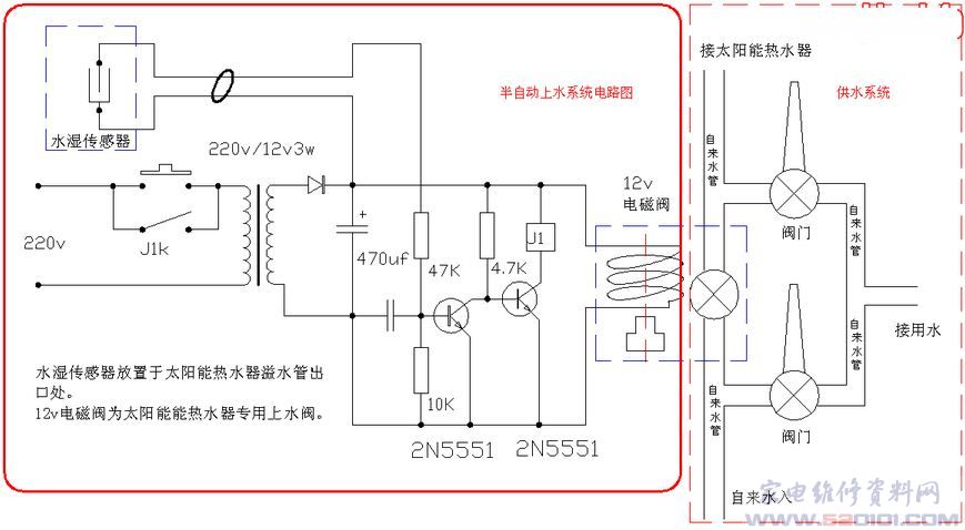 所以我要做一个半自动的太阳能热水器上水系统。需要上水时“按一下”上水按钮,自动上水,水满自动关闭,自动切断设备的供电,简易的电子装置可以几十年也不损坏。