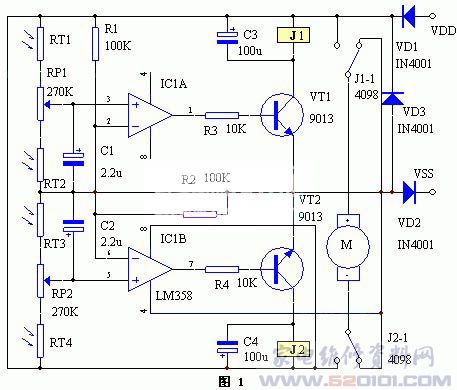 电路原理图如图1所示,双运放LM358与R1、R2构成两个电压比较器,参考电压为VDD(+12V)的 1/2。光敏电阻 RT1、RT2与电位器 RP1和光敏电阻RT3、RT4与电位器RP2分别构成光敏传感电路,该电路的特殊之处在于能根据环境光线的强弱进行自动补偿。如图2所示,将RT1和RT3安装在垂直遮阳板的一侧,RT4和RT2安装在另一侧。当RT1、RT2、RT3和RT4同时受环境自然光线作用时,RP1和RP2的中心点电压不变。如果只有RT1、RT3受太阳光照射,RT1的内阻减小,LM358的③脚电位升高,①脚输出高电平,三极管VT1饱和导通,继电器K1导通,其转换触点3与触点1闭合。同时RT3内阻减小,LM358的⑤脚电位下降,K2不动作,其转换触点3与静触点2闭合,电机M正转;同理,如果只有RT2、RT4受太阳光照射,继电器K2导通,K1断开,电机M反转。当转到垂直遮阳板两侧的光照度相同时,继由器K1、K2都导通,电机M才停转。在太阳不停地偏移过程中,垂直遮阳板两侧光照度的强弱不断地交替变化,电机M转——停、转——停,使太阳能接收装置始终面朝太阳。4只光敏电阻这样交叉安排的优点是:(l)LM358的③脚电位升高时,⑤脚电位则降低,LM358的⑤脚电位升高时,③脚电位则降低,可使电机的正反转工作既干脆又可靠;(2)可直接用安装电路板的外壳兼作垂直遮阳板,避免将光敏电阻RT2、RT3引至蔽阴处的麻烦。