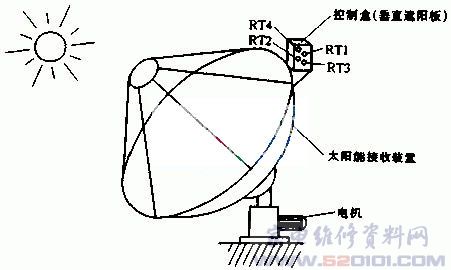 整个太阳能接收装置的结构如图2。兼作垂直遮阳板的外壳最好使用无反射的深颜色材料,四只光敏电阻的参数要求一致,即亮、暗电阻相等且成线性变化。安装时,四只光敏电阻不要凸出外壳的表面,最好凹进一点,以免散射阳光的干扰;垂直遮阳板(即控制盒)装在接收装置的边缘,既能随之转动又不受其反射光的强烈照射。凋试时,首先不让太阳直接照到四只光敏电阻上,然后调节RP1、RI2,使LM358两正向输人端的电位相等且高于反向输人端0.5V-1V。调试完毕后,让阳光照到垂直遮阳板上,接收装置即可自动跟踪太阳了。