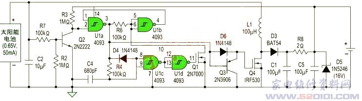 图中电路通过采用工作在单个太阳能电池电压下的自振荡升压电路解决了这个问题,而且它能对电池进行连续的涓流充电。