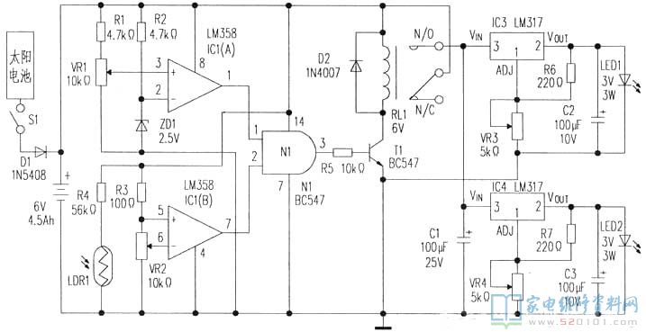控制单元由电池电压检测、光线检测和逻辑电路三部分组成。电池电压检测由IC1A和ZD1等构成,以防止蓄电池过度放电。放电限值由R1/VR1分压电路设定。IC1A②脚的基准电压由稳压管ZD1确定。当蓄电池电压低至设定电压时,IC1A输出变为低电位。蓄电池的放电范围由VR1调节。