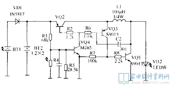 如下图所示为太阳能草坪灯电路;白天有太阳光时,由BT1把光能转换为电能,由VD1对BT2充电,由于有光照,光敏电阻呈低阻,VQ4 b极为低电平而截止。当晚上无光照时光敏电阻呈高阻,VQ4导通,VQ2 b极为低电平也导通,由VQ3、VQ5、C2、R6、L1组成的DC升压电路工作,LED得电发光。