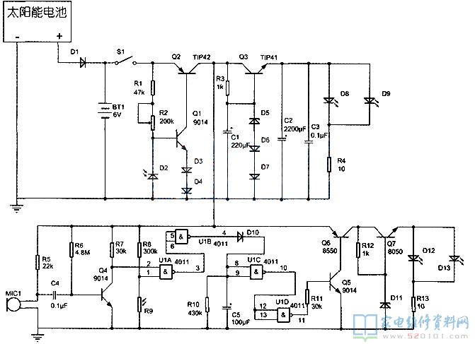 太阳能电池采用12v、100mA的太阳能电池板:D1为一只隔离二极管,本电路选择IN4001;BT1为畜电池;Q1、Q2、D2、D3、D4、R1、R2组成光控电路,光控电路由取样电路、基准电路、比较放大电路和调整电路组成,其中Q1为比较放大,Q2为调整,D2、R1、R2为取样,D2是一只光敏二极管,D3、D4提供基准电压,考虑负载工作电流情况,Q1采用9014,而Q2采用TIP42,D3、D4采用IN4148;Q3、D5、D6、D7组成稳压电路,D2采用3.0V的稳压管,D3采用1N4148的普通二极管,Q3采用TIP41;R4为限流电阻,采用2W10Q;C2、C3为高、低频的滤波电容,C2采用2200uF门0V的电解电容,C3采用O1uF的陶瓷电容。MIC1、Q4、U1、R9、Q5、Q6组成声光控制电路,Q4、Q5采用9014,U1采用4011,Q6用8550。Q7、R12、D11组成稳压电路用3.9V稳压管,Q7用8050。
