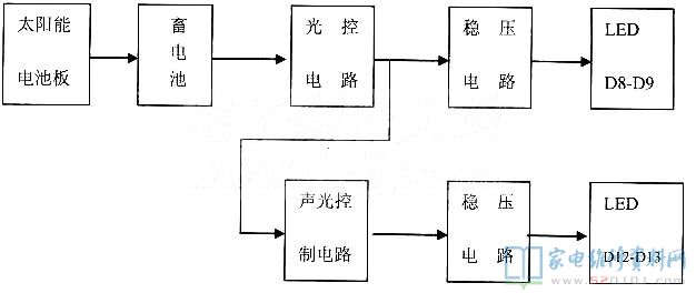 太阳能节能环保楼宇梯灯的作品实物图如右图所示,设计电路如上图所示。它主要由太阳能电池板、蓄电池、稳压电路、光控电路和声光控制电路组成,原理框图如下图所示。当有太阳光照射时,太阳能电池板产生8~12V的直流电源经D1加入到6V蓄电池BT1两端,对BT1进行充电,BT1把电能储存起来,以便晚上或光线不够时使用。