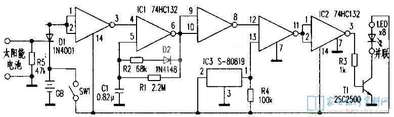 太阳能电池选多结晶硅材料的电池板,最大输出电压4.7V、最大输出电流95mA;蓄电池为4W2.5Ah;DI为充电防逆流二极管;1ED为八只高亮发光二极管并联;IC1和IC2采用2输入四与非施密特触发器74HC132,不用的与非门应将其两个输入端短路后接至电源“+”端。