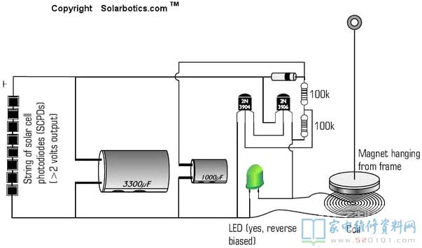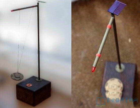 这是一个简单而又有趣的小玩意。说它简单,它仅仅由两个三极管,两个电阻,两个电容,一个二极管,一块太阳能电池,一个线圈和一块磁铁构成。说它有趣,只要有光,它像永动机一样不停地摆动,永不停息。