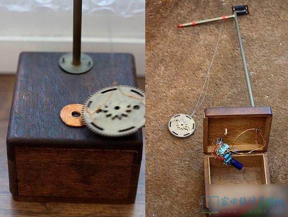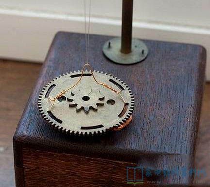 钟摆是一个齿轮,底部固定有一块磁铁,通过细细的鱼线吊在横杆上。
