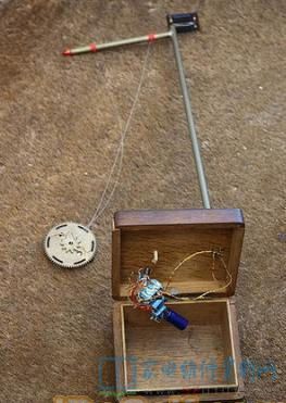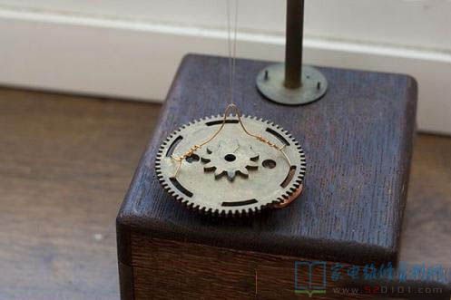 钟摆是一个齿轮,底部固定有一块磁铁,通过细细的鱼线吊在横杆上