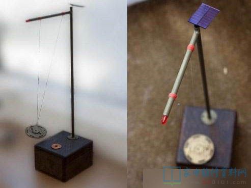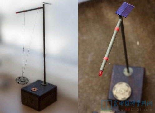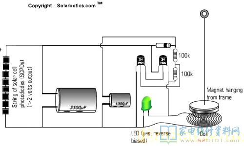 太阳能钟摆成品也不贵,但自己动手做一个放在桌子上更显个性,这是一个简单而又趣味的桌面装饰品,它仅仅由两个三极管,两个电阻,两个电容,一个二极管,一块太阳能电池,一个线圈和一块磁铁构成。只要有光,它像永动机一样不停地摆动,永不停息。