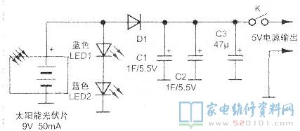 超级电容的耐压为5.5V,为了不至于在光线强的情况下长时间充电造成电压超过电容的耐压上限,电路采用了稳压措施。电路在光伏片两端并联接入了两个串联的蓝色LED灯。蓝色LED的工作电压为3.3V,两只串联则为6.6V;这个电压通过二极管D1加到超级电容上,可使充电电压上限稳定在6V左右;虽然超出超级电容器的耐压约0.5V,但不影响电路的正常使用。